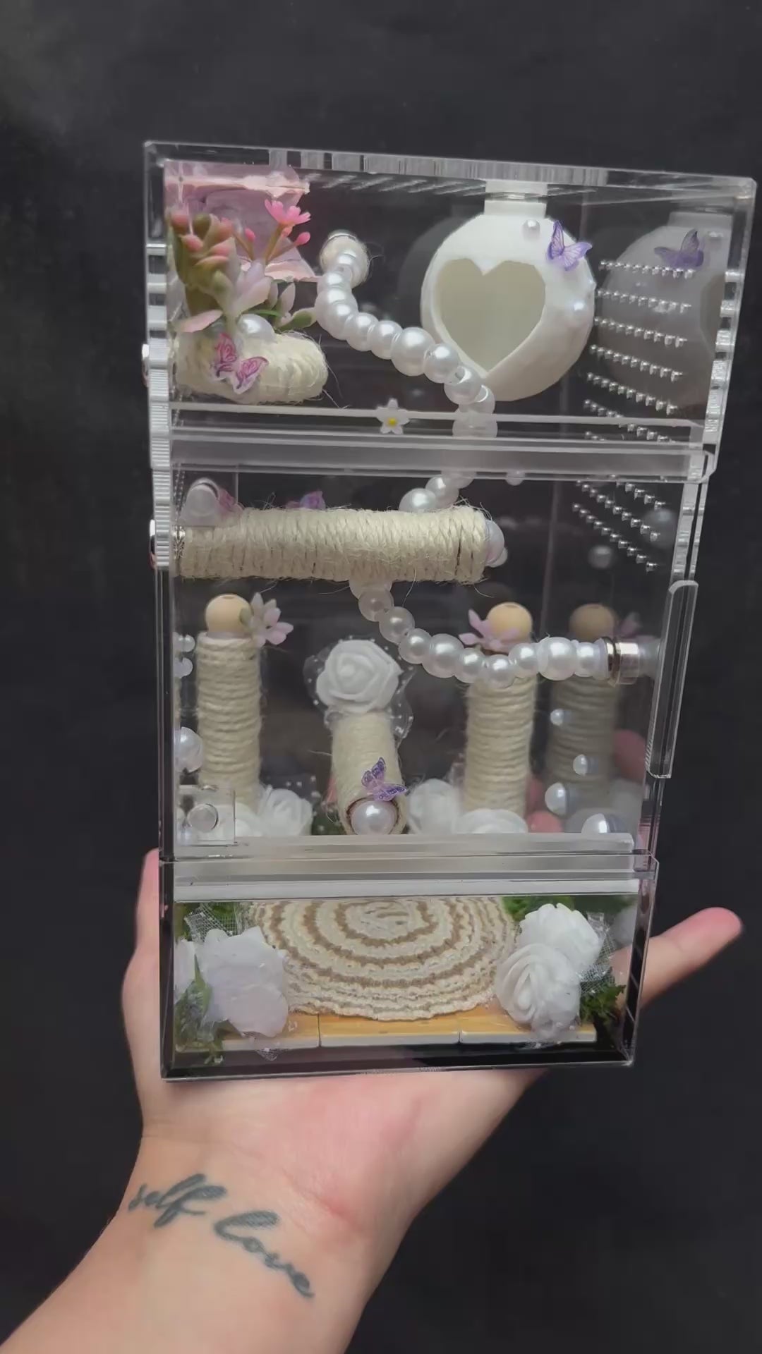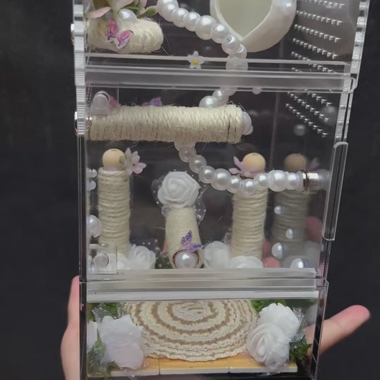 This 4x4x7 inch custom butterfly palace enclosure features soft pink and purple artificial foliage, wood slices wrapped in yarn for climbing, faux moss substrate, a pearl-beaded climbing bridge, a 3D printed hide, and cross ventilation on the top and sides. Ideal for an adult, this setup is handmade and free to re-arrange to your liking as most of the decor is made with magnets.