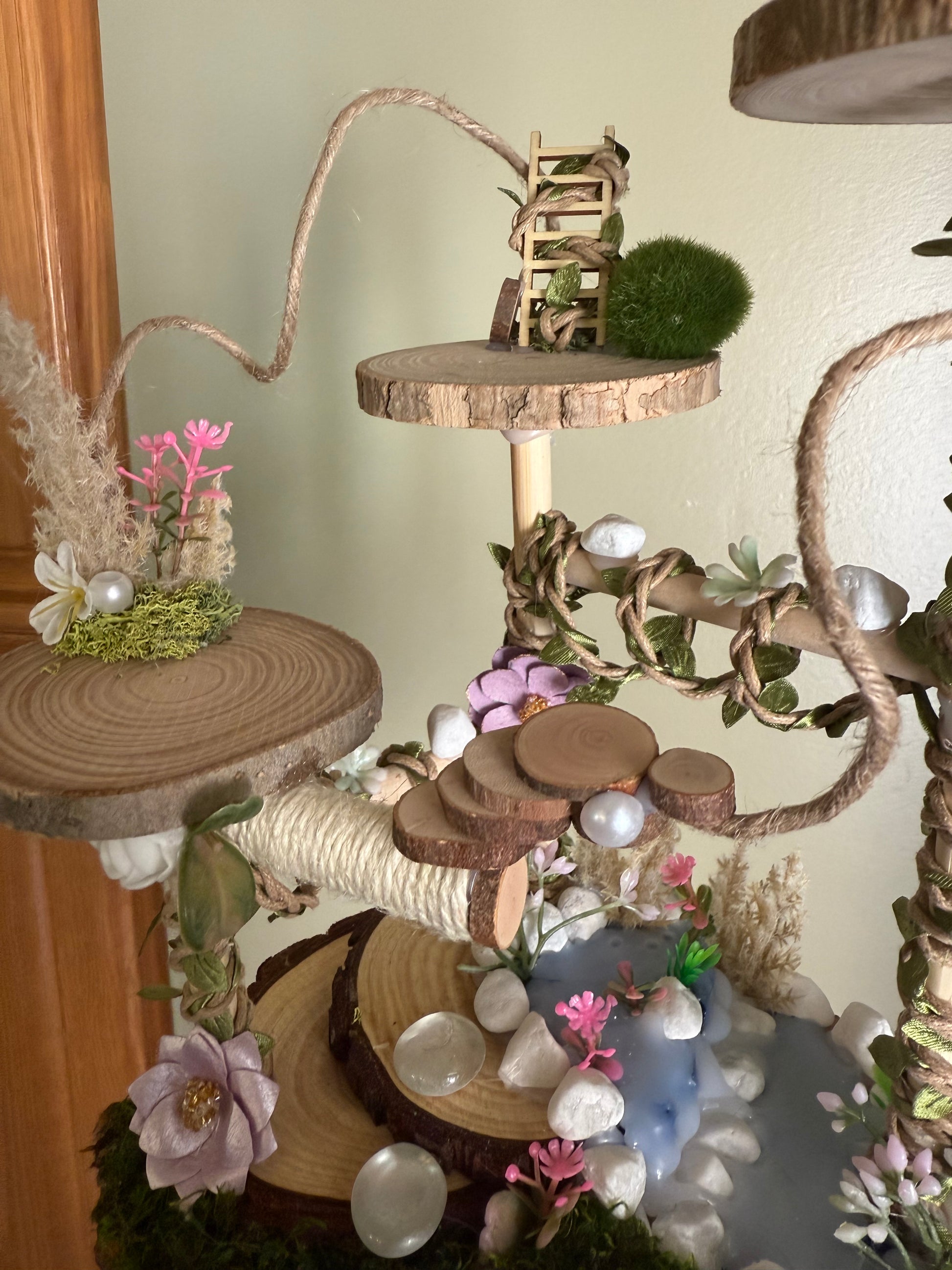 This medium/large sized spider playground is inspired by mossy forests and waterfalls in Colorado, USA, and is made entirely by hand. With real wood, soft moss, and natural touches, this playground offers plenty of cozy textures, vines, and spots to explore.